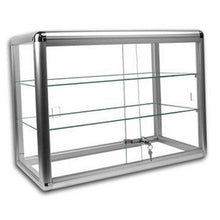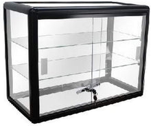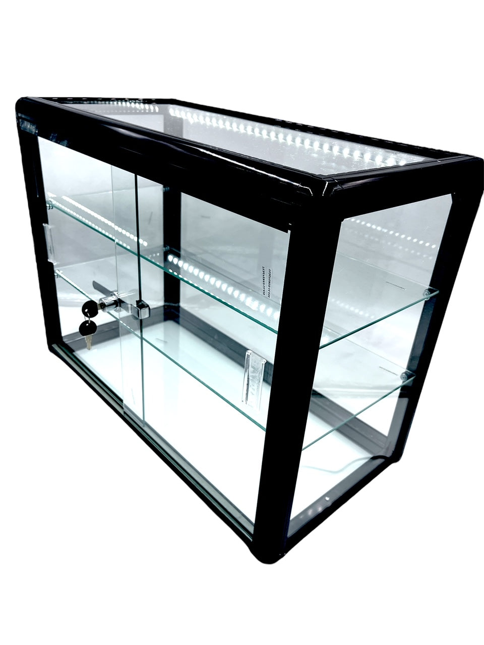 Introducing the Glass Counter Display Case, the perfect addition to any store or trade show display. This sleek and modern display case is designed to sit perfectly on any counter top, making it convenient and space-saving. With its black and silver finish, this display case is not only functional but also adds a touch of elegance to your space.