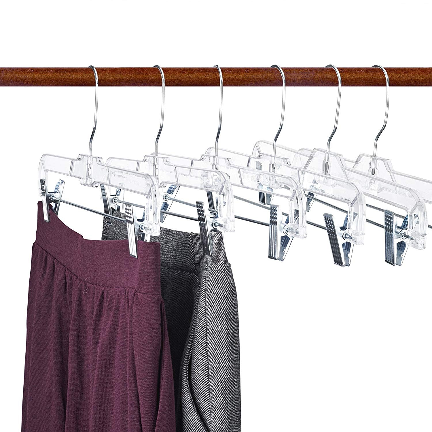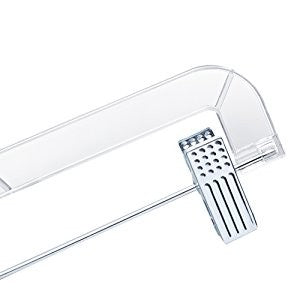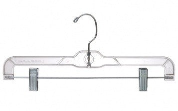 Only Hangers clear plastic pant and skirt hangers come with a polished steel swivel hook and strong metal clips with cushions for hanging. The swivel hook enables you turn the garment side to side without removing it from the hanger. The clips adjust and slide easily on the bar to accommodate hanging any size pants, shorts or ladies skirts. We only use heavyweight clear plastic in manufacturing our clothing hangers for strength and durability. Now they are conveniently sold in small bundles of 25 hangers, half boxes of 50 hangers or economical boxes of 100 hangers.